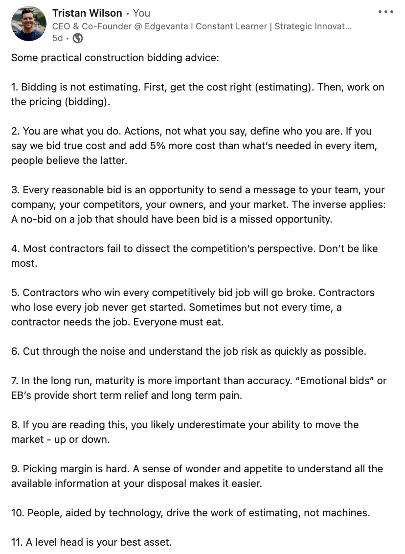 Tristan Wilson is the CEO and Co-Founder of Edgevanta. We make software that helps contractors win more work at the right price.